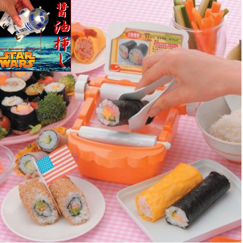 Après le Sony rolly: le sushi rolling, moins bruyant et moins cher. Bandai a fabriqué un rouleur de sushi pour enfants, afin de les sensibiliser à l’ art de la cuisine japonaise! Le rouleur pourrait très bien servir aux parents, le soir, quand les enfants sont couchés, à rouler de gros cigares bourrés d’herbe…Bref, si vos enfants aiment jouer à la dinette exotique, vous pouvez leur offrir en prime le pot de sauce soja qui vient tout droit de l’espace!!