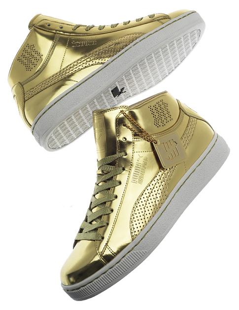 Je sais ce que vous vous dites… encore Puma, le dernier article était sur Puma… et bien qu’est ce que vous voulez, une petite marque qui commence, moi je n’ai qu’une seule envie : booster leur marketing! Sans blague, pour le moment, ils sortent des modèles de feu, comme ces Suede Mid en Or 1000 carats! Cette édition, utlra limitée (72 paires seulement !!!), ne sera distribuée que dans les shops UNDFTD de Tokyo, Los Angeles et trois autres encore secrets. La date de mise en vente est fixée au 7 février et à mon avis, le 8 vous pouvez vous brosser pour en trouver…à moins que… peut être sur ebay mais à mon avis à des prix défiant toute raison! (vu sur SneakerFreaker). Peace!