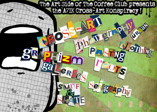 Au programme, depuis la fin juin: pasting, crossart, photographie, sérigraphie, encre de chine et j’en passe…BIG YEAH! David Naville, Mr X et Mata7ik ont mis en place une expow bien roots. A vos fisheyes, prêts, partez! Une seule adresse: The Coffee Club, rue du Bailli 38, Bruxelles. Contact? a7ik@a7ik.net