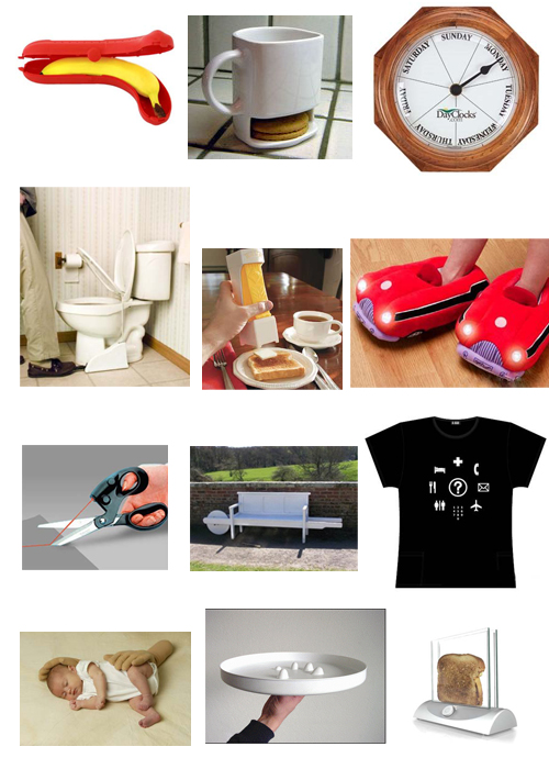 la tasse à café dans laquelle vous pouvez loger vos cookies préférés,le protège banane, qui ne s’est jamais retrouvé au boulot avec une banane diforme comme collation?, le toaster transparent avec lequel vous grillerez votre tranche de pain à la perfection, le découpeur de beurre qui vous facilitera la tâche le matin, l’horloge qui annonce les jours, la paire de ciseaux lazer qui vous aidera à faire des coupes chirurgicales,le lève cuvette qui, grâce une simple pression du pied, vous évitera pas mal de disputes conjugales,les pantoufles voiture à phares éclairants, pratiques pour les escapades nocturnes vers les toilettes,les mains en mousse qui apporteront le reconfort à bébé, le t-shirt spécial travel qui vous aidera à communiquer avec les autochtones en leur indiquant du doigt vos besoins de touriste,le plateau inrenversable grâce à ses petites cavités dans lesquelles vous glisserez vos doigts de maladroit, et pour finir, le banc-brouette que vous emmenerez partout où vous aurez envie de vous asseoir.