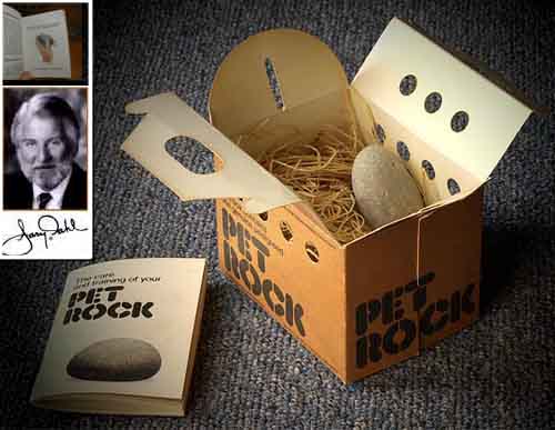 En 1975, alors qu’il était employé dans une agence de pub, Gary Dahl mis en vente des pierres qui le rendirent multimillionnaire en l’espace de 6 mois. Impossible me direz vous?? Et bien non, tout est dans le concept: Gary parvint à convaincre 5 millions de personnes qu’il ne vendait pas de simples cailloux mais des petits animaux domestiques, d’où le nom Pet Rock. Le coût de production étant dérisoire — les cailloux et l’emballage en carton ne coûtent pas très cher — Gary se mettait 3 dollars en poche pour chaque vente. Bénéfices de l’opération: 35 millions de dollars. Tout ça me fait penser que j’ai une grosse collection de coquillages et que je ne savais pas quoi en faire jusqu’à présent…